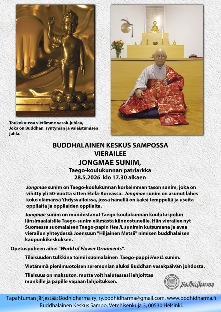 Torstai meditaation yhteydessä Taego-koulukunnan mestarin kunnianarvoisa Dr. Jongmae Parkin opetuspuheen aiheena on ”World of Flower Ornaments”.